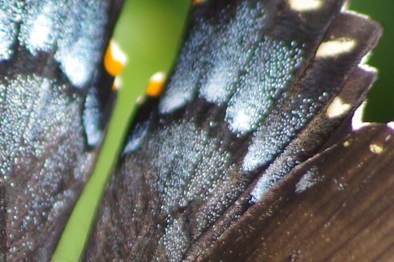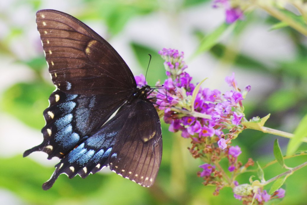 These pictures tell the tragic story of a dark female Eastern Tiger Swallowtail butterfly sipping nectar on a Blue Chip butterfly bush in my front garden.